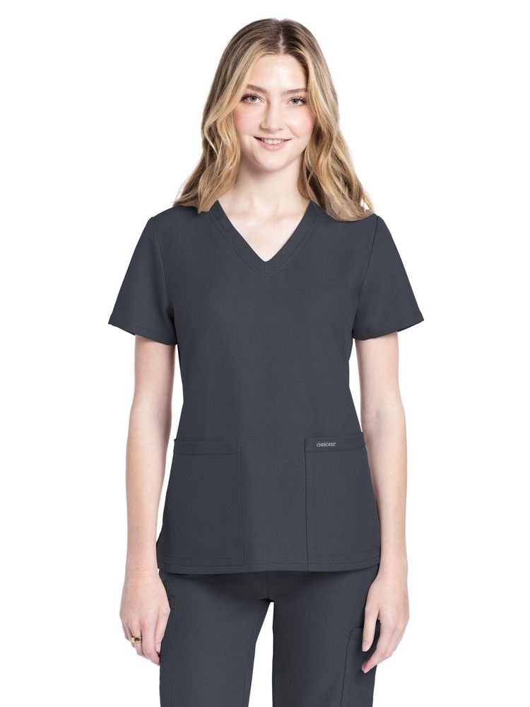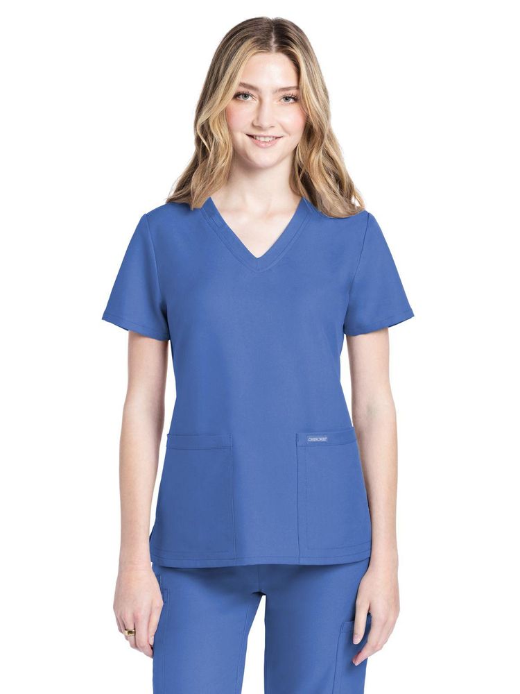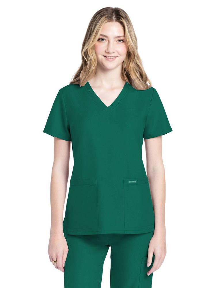 A v-neck top with built-in functionality elevates basic v-neck styling. There is a dyed-to-match flat bungee on the neckband for an ID badge loop. There are two roomy patch pockets with a reverse hem trim. Side vents at hem for ease of movement. Decorative tonal topstitching adds the finishing touch to this scrub top. Modern Classic fit. Featuring PROTX2 technology with antimicrobial and moisture wicking properties. Center back length: 26"