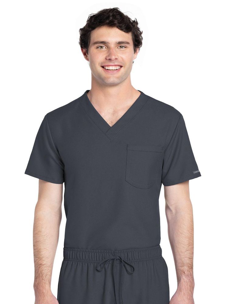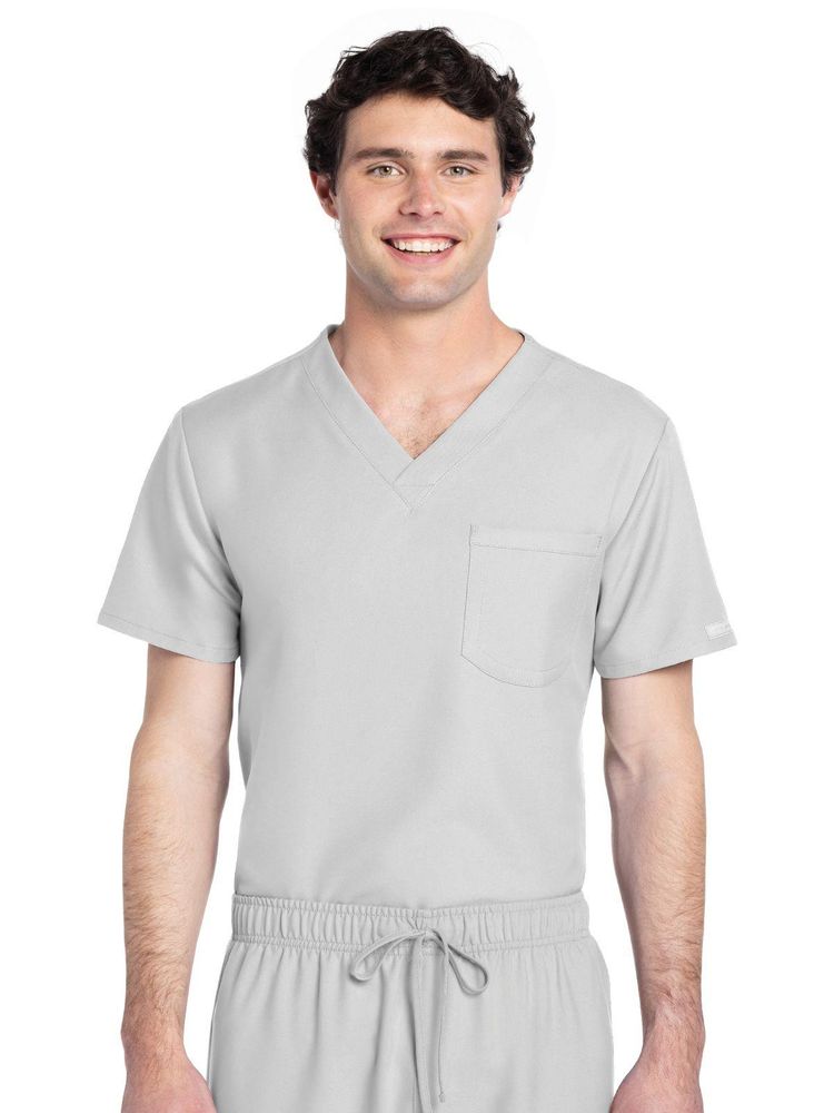 This Unisex fit v-neck top offers genderless classic styling. Chest patch pocket with reverse hem trim. Decorative tonal topstitching. Featuring PROTX2 technology with antimicrobial and moisture wicking properties. Center back length: 28"
