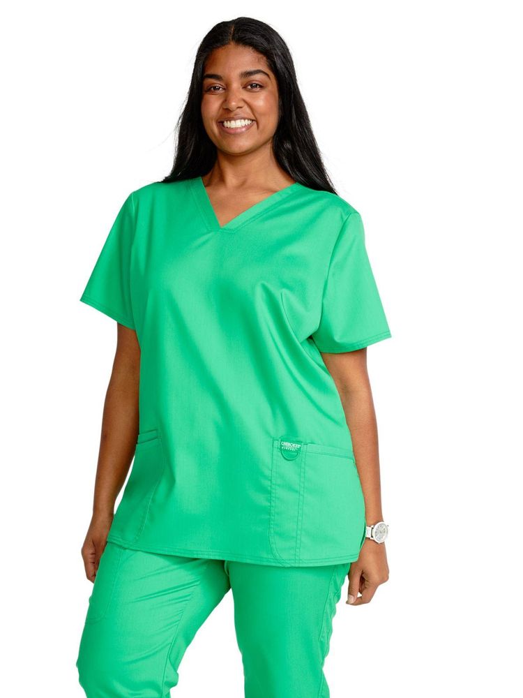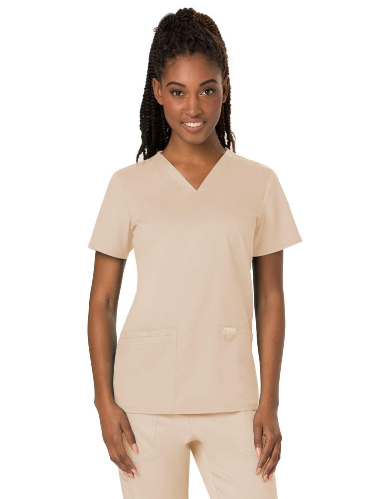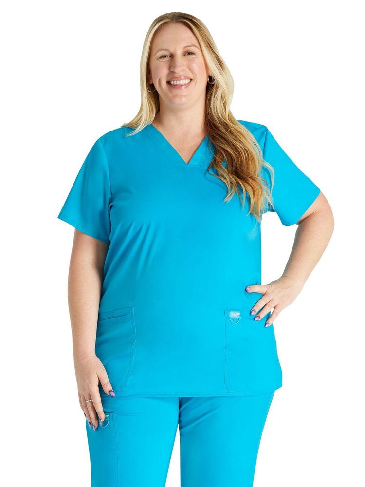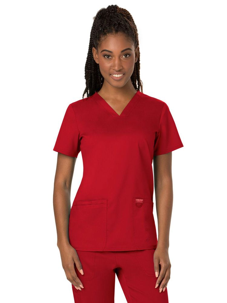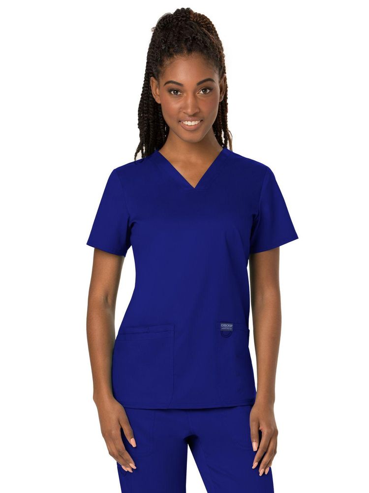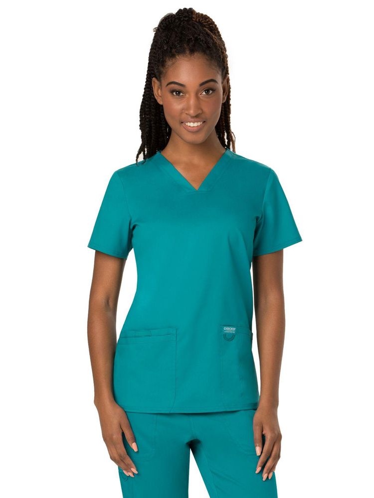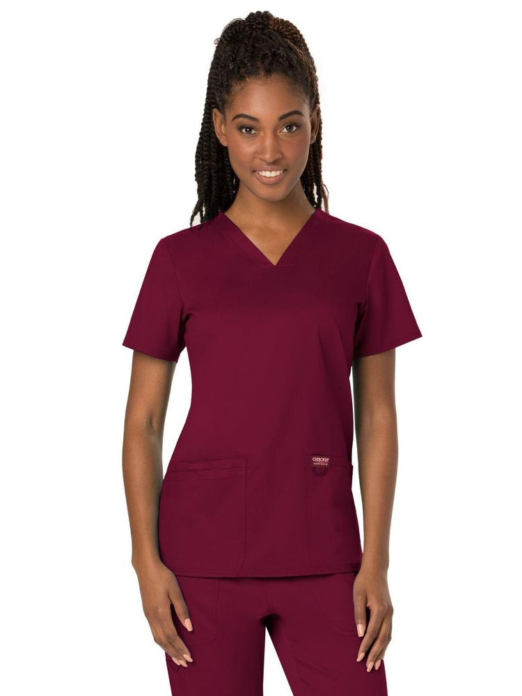 A modern classic fit v-neck top includes patch pockets, an instrument loop, a pencil stitch, a logo label with a bungee loop, back princess seams, and side vents.