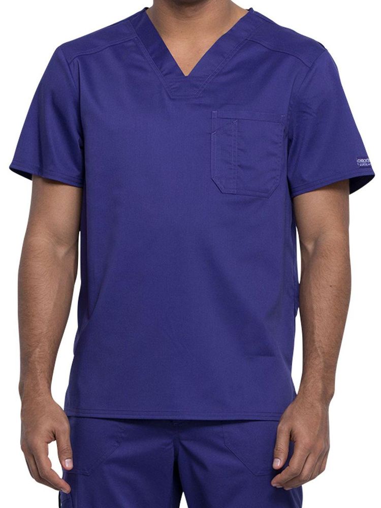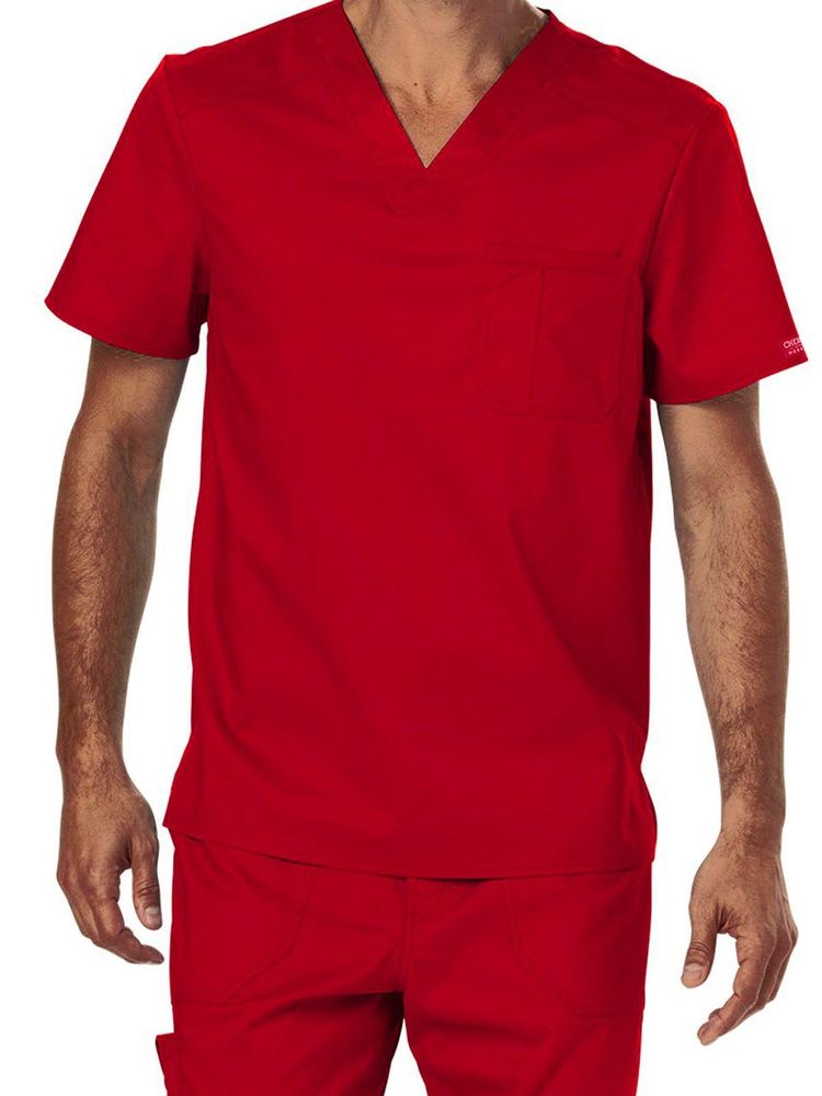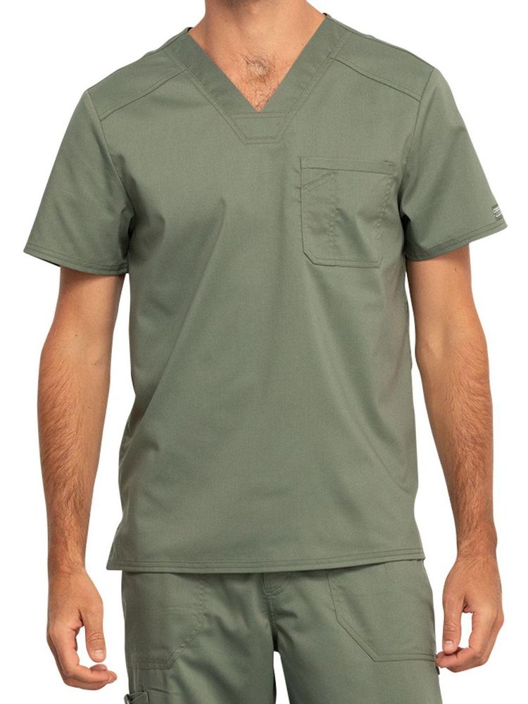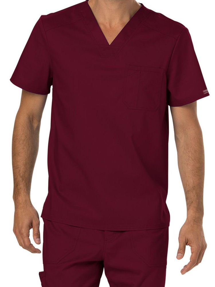 • A men's modern fit v-neck top includes a chest pocket with an extra pen pocket, a back yoke, and side vents. This style looks great tucked in or untucked.