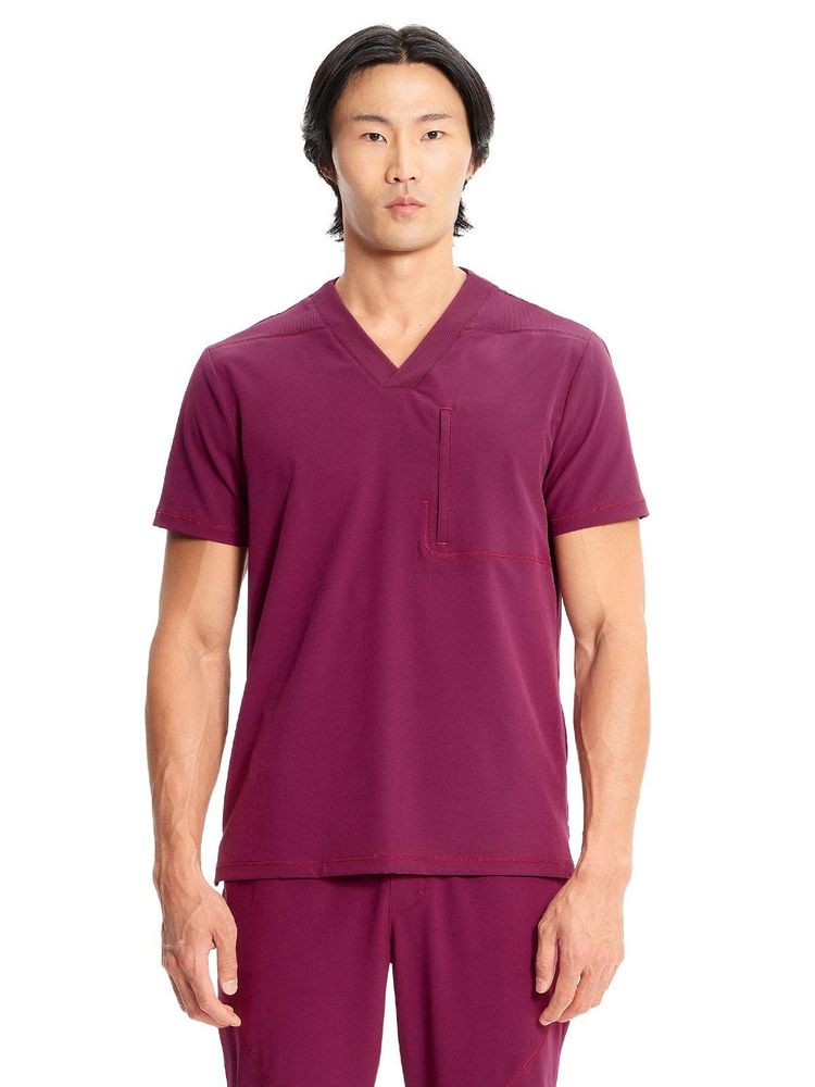 This Men's fit v-neck top has a dyed-to-match rib-knit neckline, front shoulder yokes, and a center back panel. There is one welt zipper chest pocket with contrast colored soft zipper pull for easy grip and contrast mesh pocket bag. A back yoke seam provides a better fit across the shoulders. The side vents are lined with logo twill tape for hidden detailing. A high-low hem completes the look. Center back length: 27 ½"