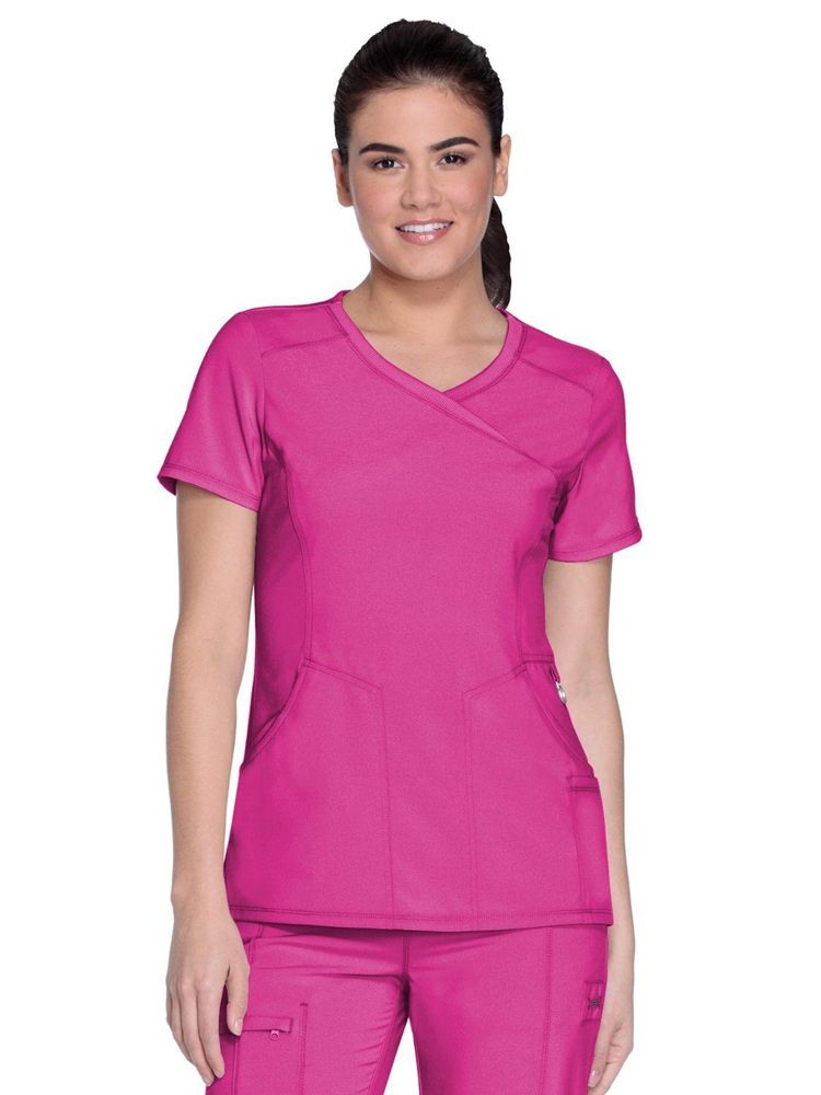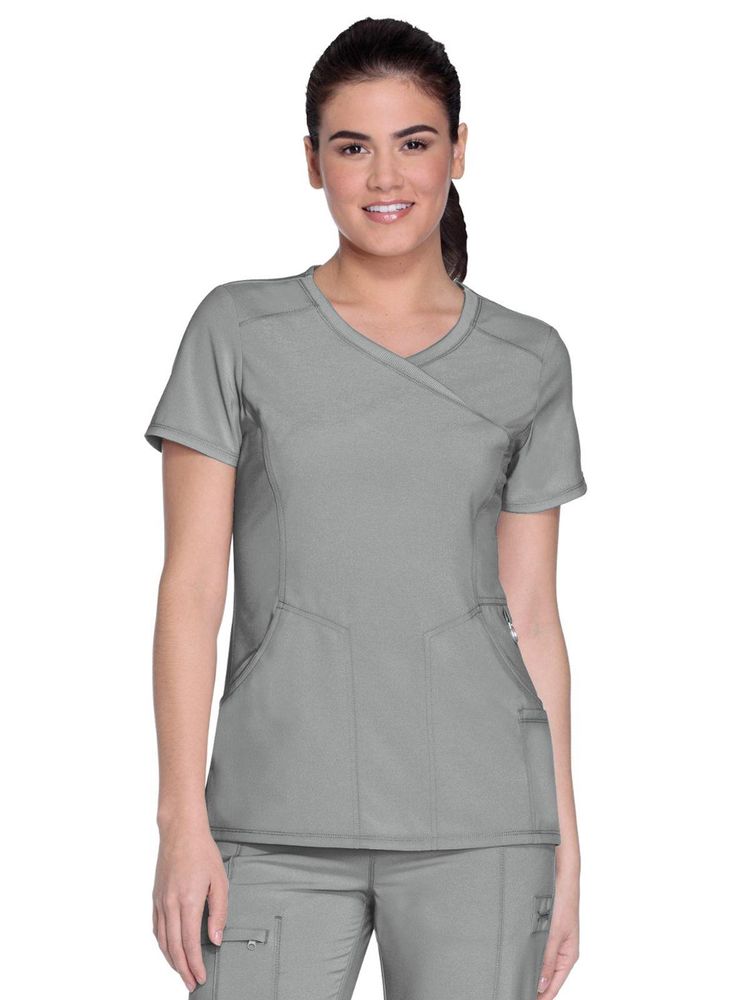 A Contemporary fit mock wrap top features two set-in front pockets, a logo O-ring above left pocket, left scissor pocket, one interior pocket, front and back princess seams, and side vents. Stretch rib knit at the center back panel gives this top its slimming shape and allows for extra movement and comfort. Center back length: 26". The comfortable stretch poplin fabric and super stretchy rib knit is the perfect combo for healthcare professionals.