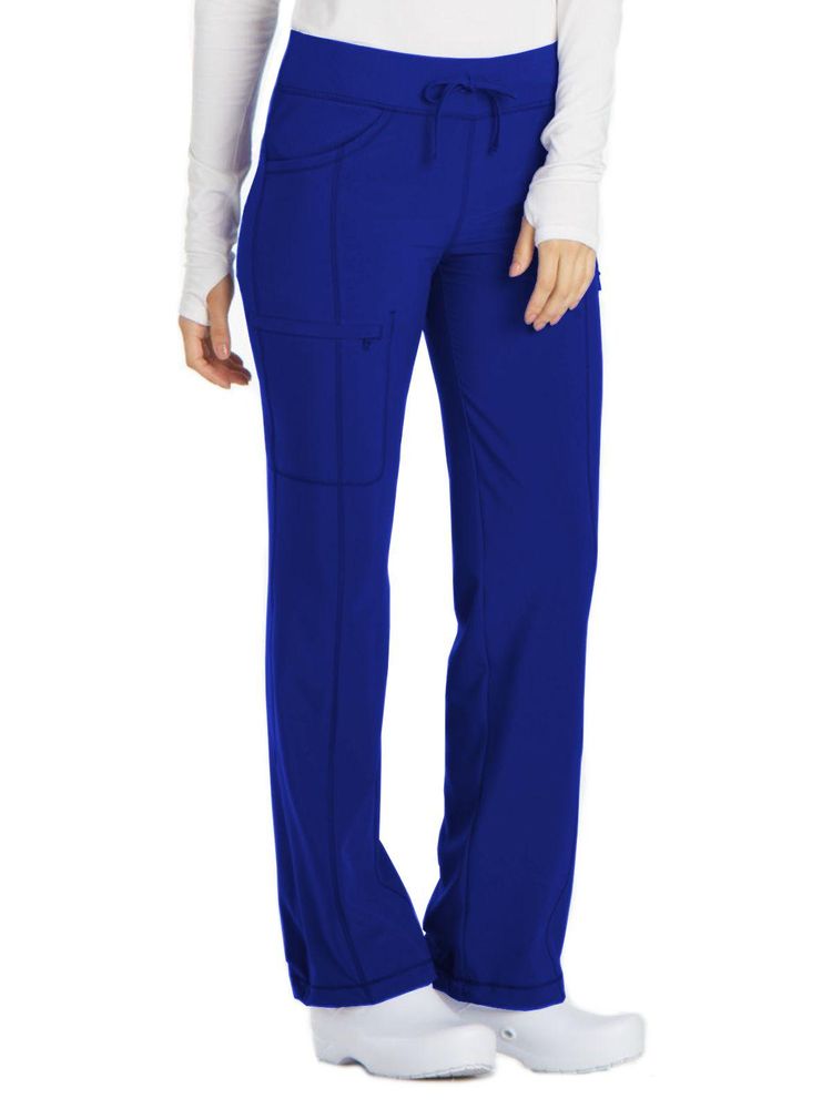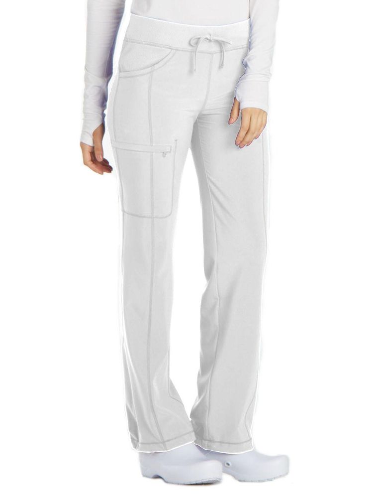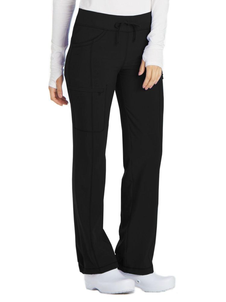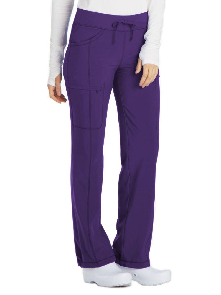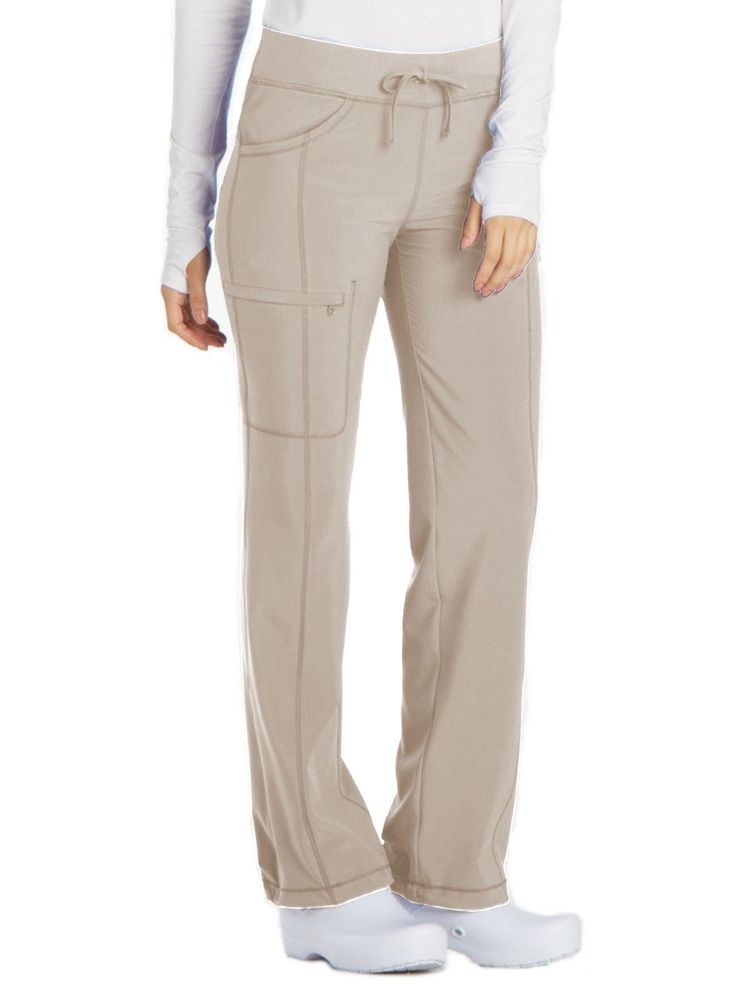 A Contemporary fit, low rise, straight leg pant features an elastic knit waistband and adjustable drawstring. Also featured are rib knit front and back yokes, angled front pockets, front leg seams with a zip closure cargo pocket, one back patch pocket, a bungee instrument loop below left pocket, a bungee cord with a toggle at the leg hems for adjustability and coverstitch detail throughout. Inseam: 31" The comfortable stretch poplin fabric and super stretchy rib knit is the perfect combo for healthcare professionals.