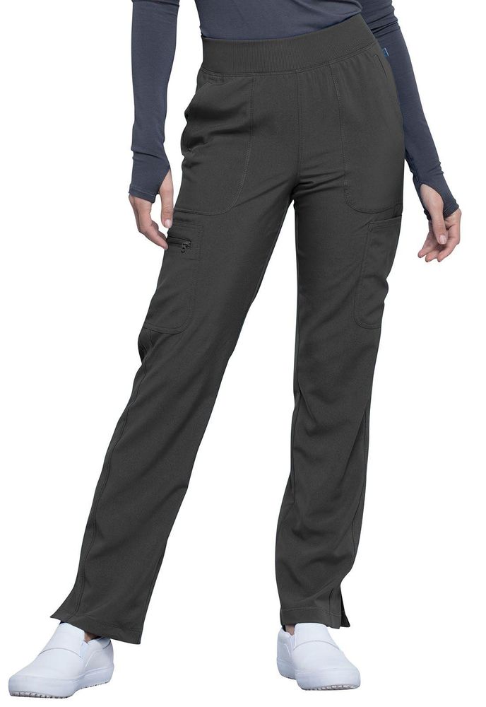 This mid rise tapered leg pant features pull-on styling with rib-knit waistband, front welt and cargo pockets, back patch pockets, and side vents at the hem for ease of movement. Leg opening: 14". Inseam: 30 1/2".