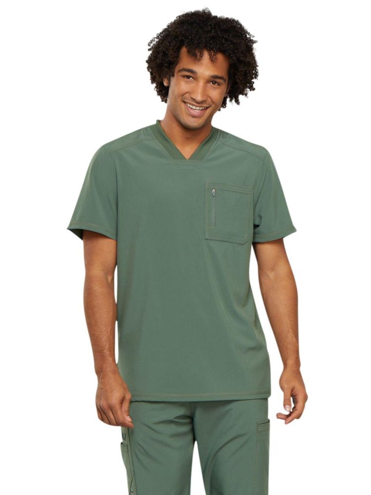 A Men's Modern fit V-neck top features a chest pocket with zip closure for security, instrument loop on the left sleeve, front and back yokes with triple-needle topstitching, and stretch rib knit neckband and back panels for extra comfort. This style looks great tucked in or untucked. Center back length: 29 1/2". The comfortable stretch poplin fabric and super stretchy rib knit is the perfect combo for healthcare professionals.