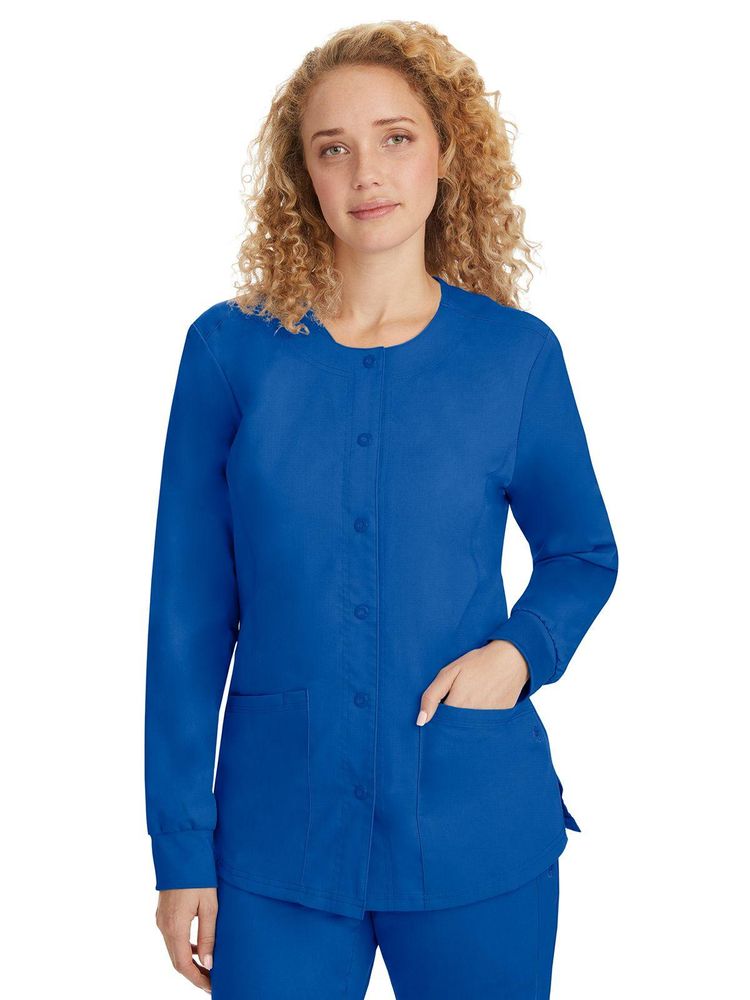 The Purple Label line by Healing Hands Scrubs was designed for performance and comfort. The easy care Poly/Rayon blend is durable while still feeling luxurious on the skin. With just the right amount of stretch, Purple Label scrubs are made to move with you through even the longest shift. The "Daisy" jacket features Healing Hands logo snap front closure, princess seams for superior fit, soft knit cuffs, round neck, 2 patch pockets, and one cellphone pocket.77% Polyester/20% Rayon/3% Spandex. Modern fit. Center back length: 26".