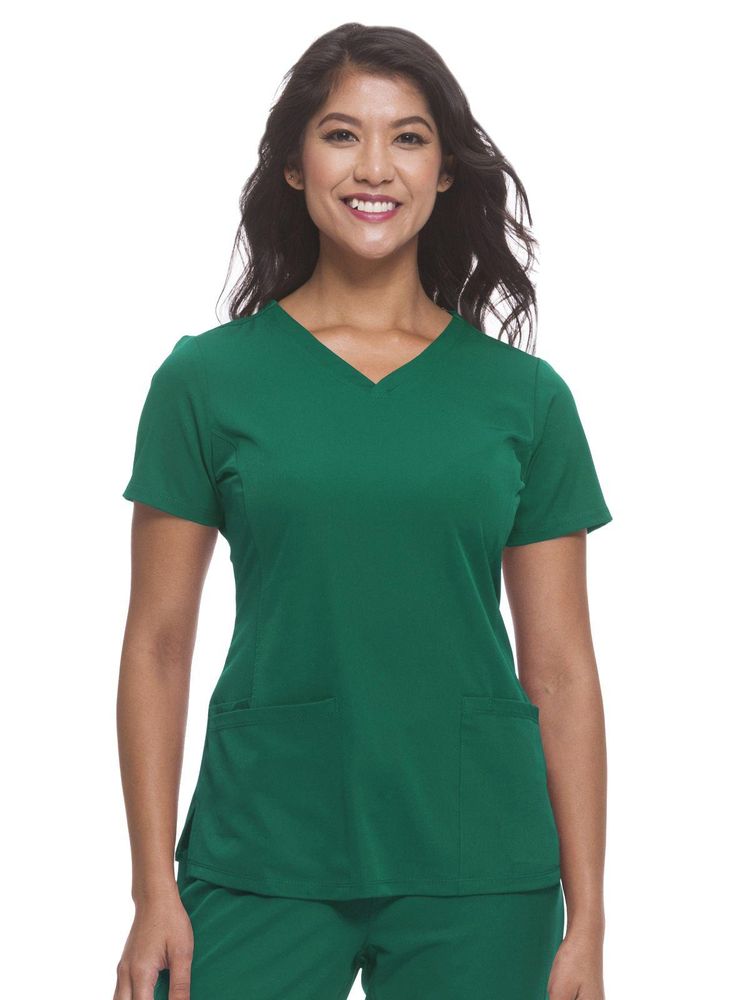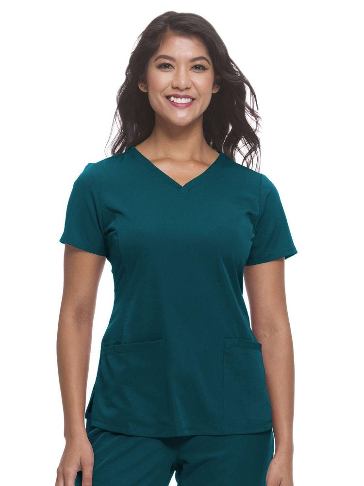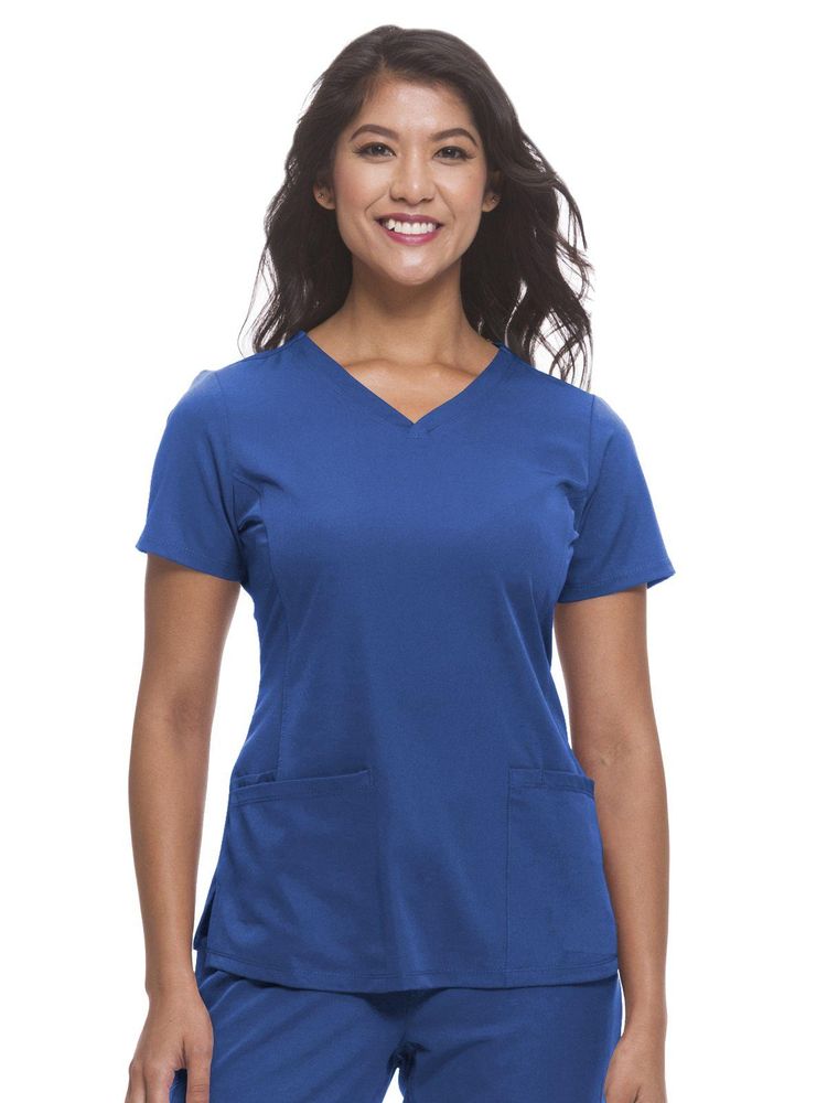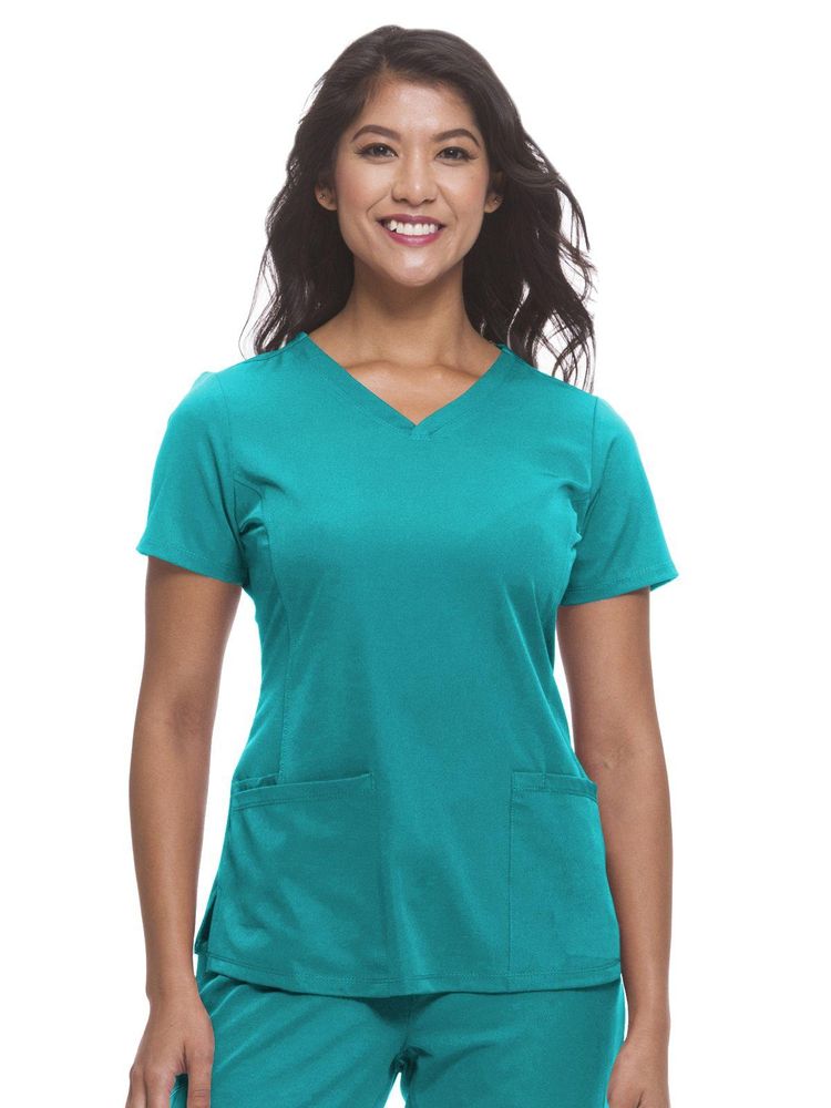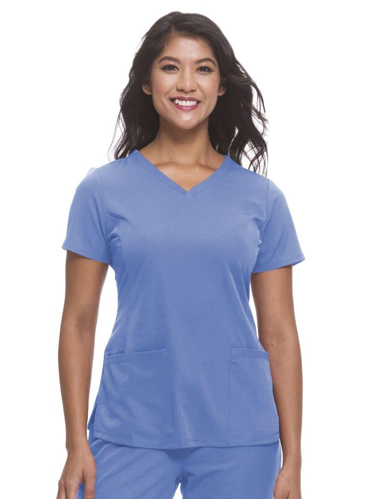 V-neck scrub top with 2 pockets and 1 media pocket. Wicks moisture quickly. Optimum mobility and comfort. Wash, dry, and wear. Won't fade. Elegant styling. Well-balanced fit. Center back length: 26.5".