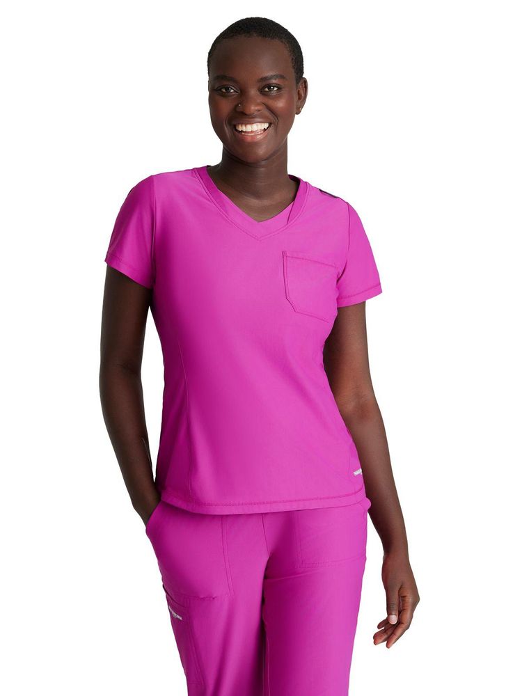 1 pocket, Banded curved neckline, Chest patch pocket, Front and back princess seams, Shoulder badge loop, Overlapping tulip effect at back hem, High-low hem, Wicks moisture, Comfort knit fabric with 360 stretch, Center back length: 25.5" (small), 86% Nylon 14% Spandex