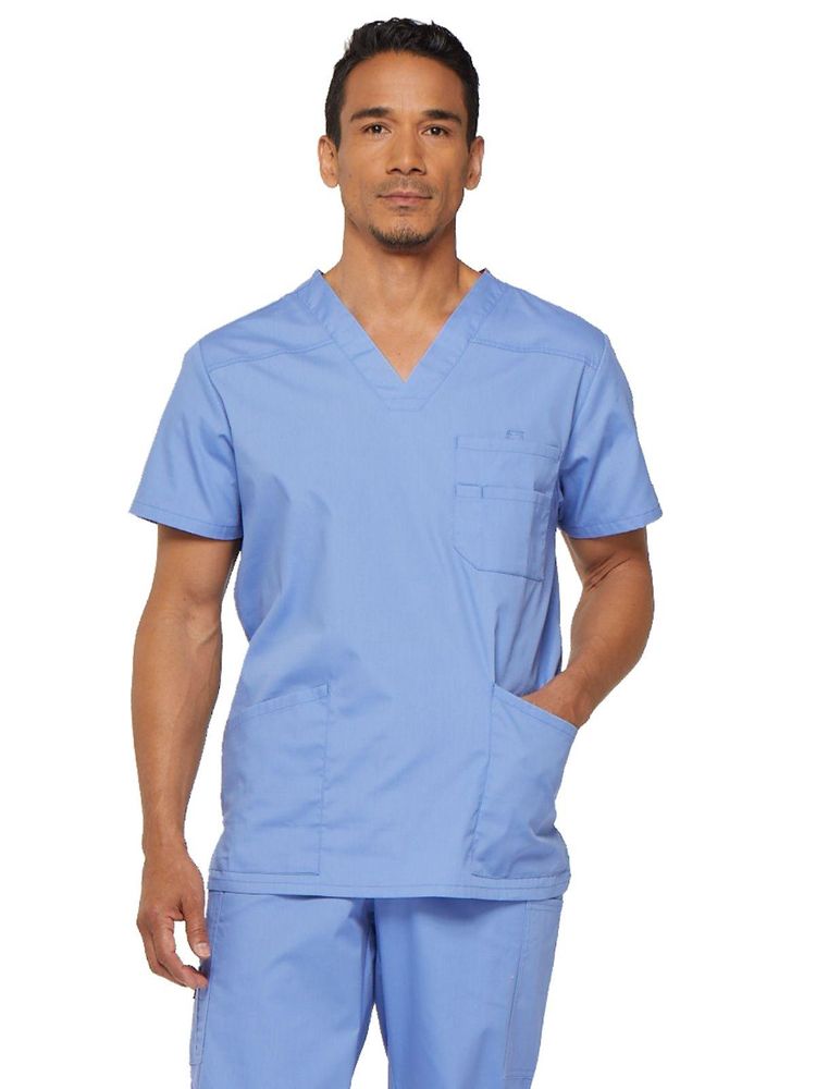 A men's v-neck top features Dickies logo twill tape at the back neck, a double chest pocket with self strapping and a D-ring. Also featured are patch pockets, a stretchy knit interior pocket, a back yoke, a center back seam, and side vents. Center back length: 29".