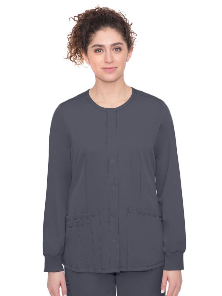 Round neck snap front jacket with 4 pockets and 1 media pocket. Wicks moisture quickly. Optimum mobility and comfort. Wash, dry, and wear. Won't fade. Elegant styling. Well-balanced fit. Center back length: 27".