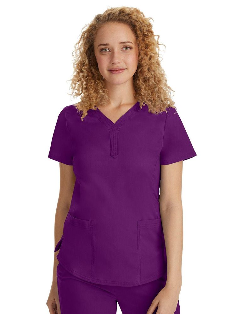 The Purple Label line by Healing Hands Scrubs was designed for performance and comfort. The easy care Poly/Rayon blend is durable while still feeling luxurious on the skin. With just the right amount of stretch, Purple Label scrubs are made to move with you through even the longest shift. This modern fit "Jane" top features a flattering Y-neck with triple needle stitching detail, 2 patch pockets and princess seaming for superior fit and style. 77% Polyester/20% Rayon/3% Spandex. Modern fit. Center back length: 24".