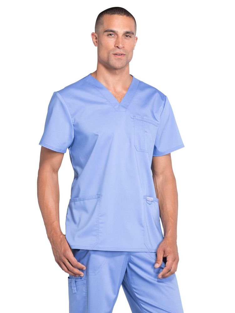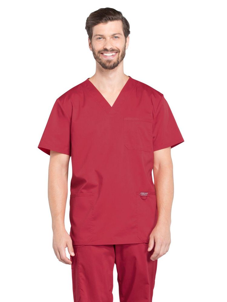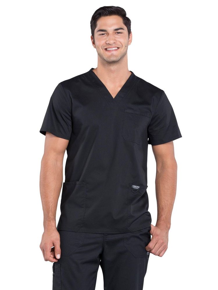 A men's modern fit v-neck top includes a chest pocket with a pencil stitch, two patch pockets, a logo label with an I.D. loop, a back yoke, and side vents.