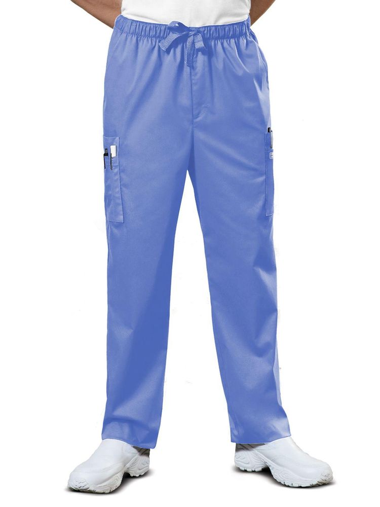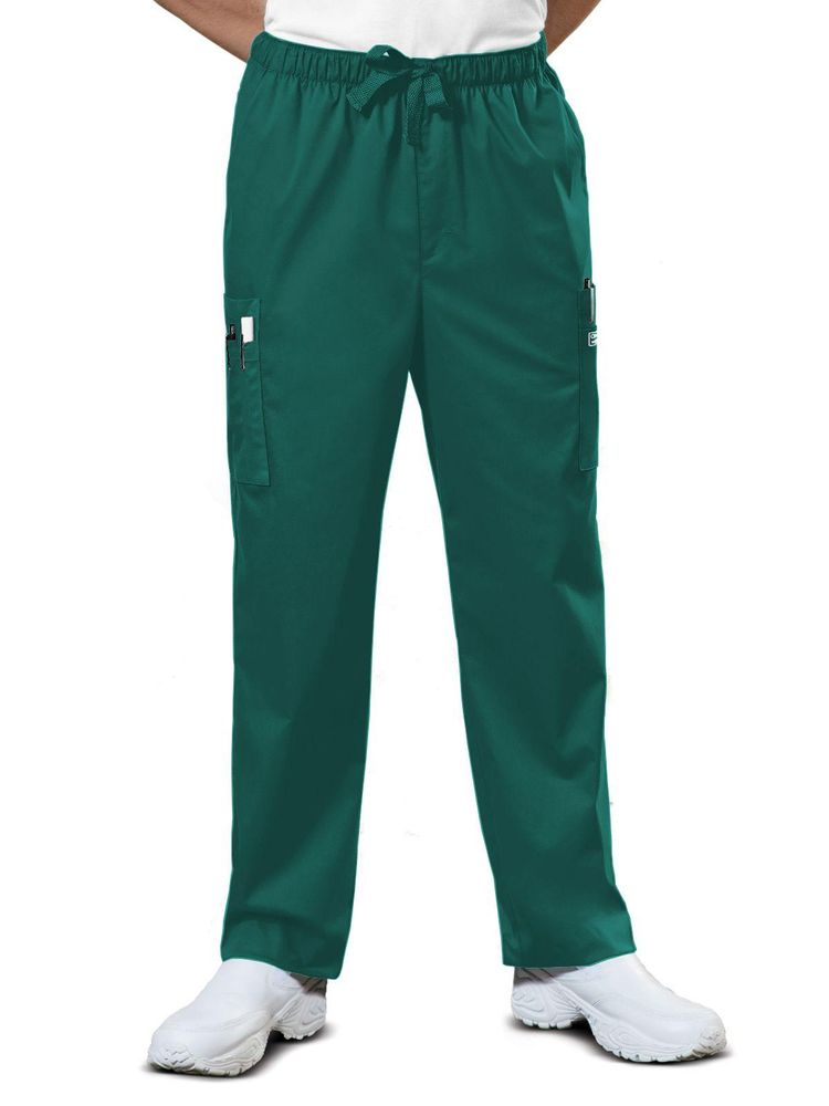 A men's traditional fit, natural rise elastic waist pant with a reinforced adjustable drawstring. Features: a functional zip fly, two front angled pockets, four side cargo pockets, and a back patch pocket with a button closure.