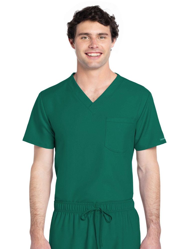 This Unisex fit v-neck top offers genderless classic styling. Chest patch pocket with reverse hem trim. Decorative tonal topstitching. Featuring PROTX2 technology with antimicrobial and moisture wicking properties. Center back length: 28"