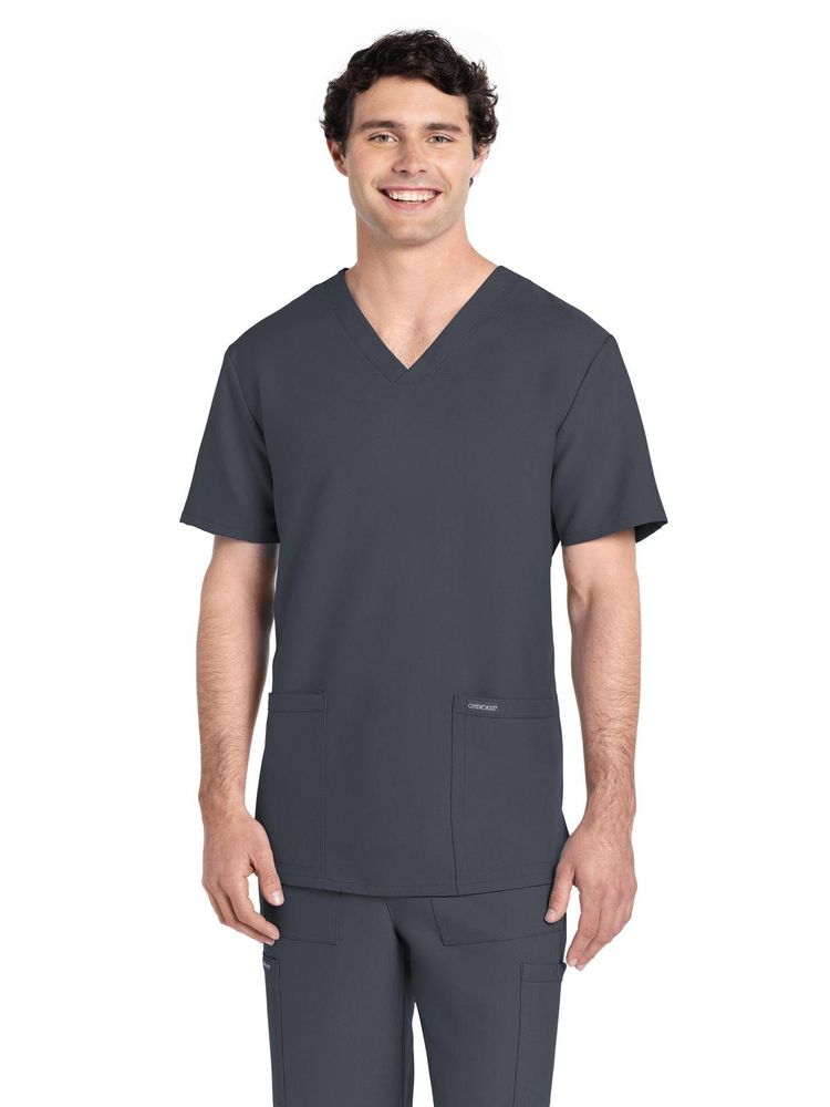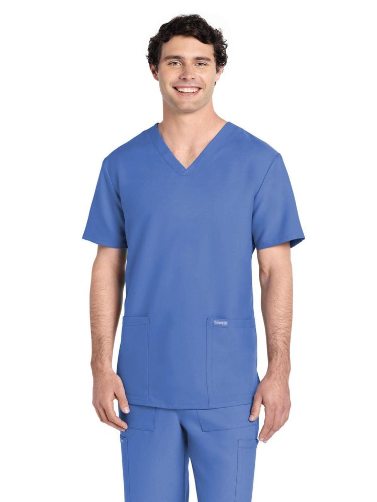 This Men's fit v-neck top features two roomy patch pockets with reverse trim at the pocket top. The are side vents for ease of movement and decorative topstitching for added style. Men's fit. Featuring PROTX2 technology with antimicrobial and moisture wicking properties. Center back length: 28 1/2"