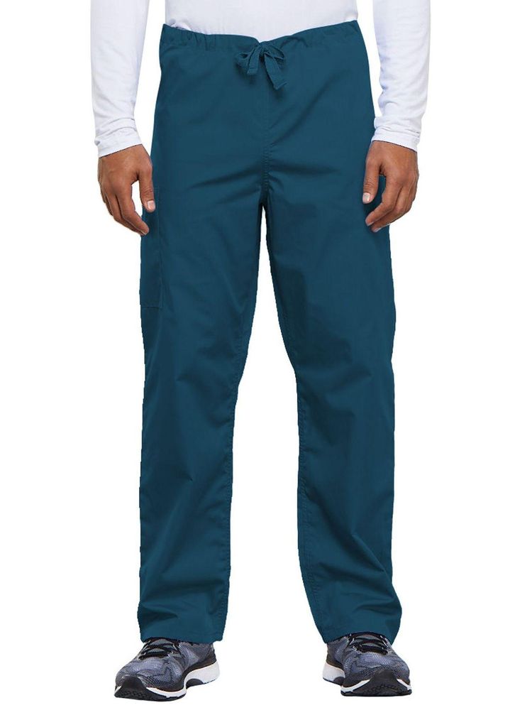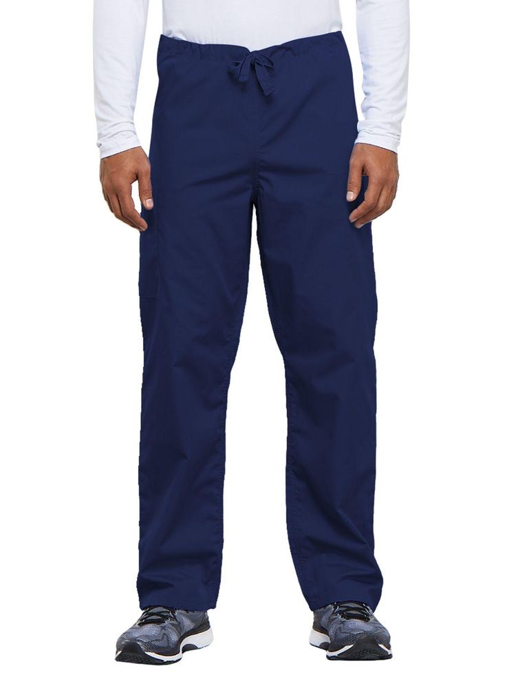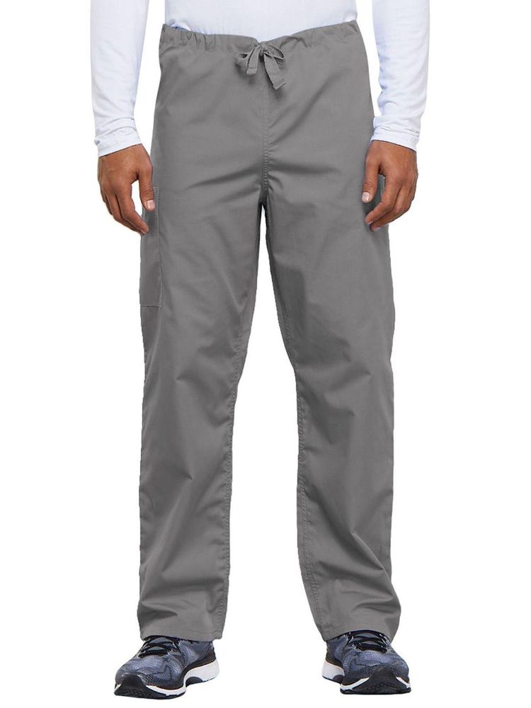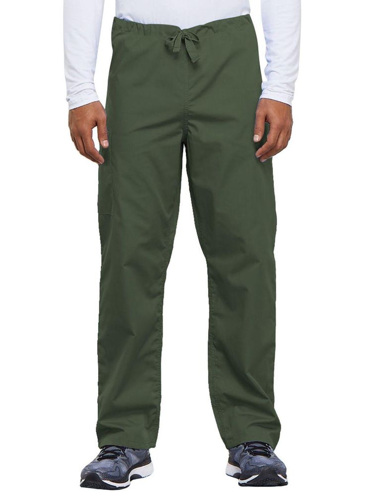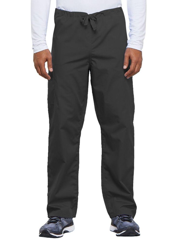 A casual unisex traditional fit pant with a natural rise, an adjustable webbed drawstring at the waist, one back pocket, and a cargo pocket with an inside cell phone pocket.