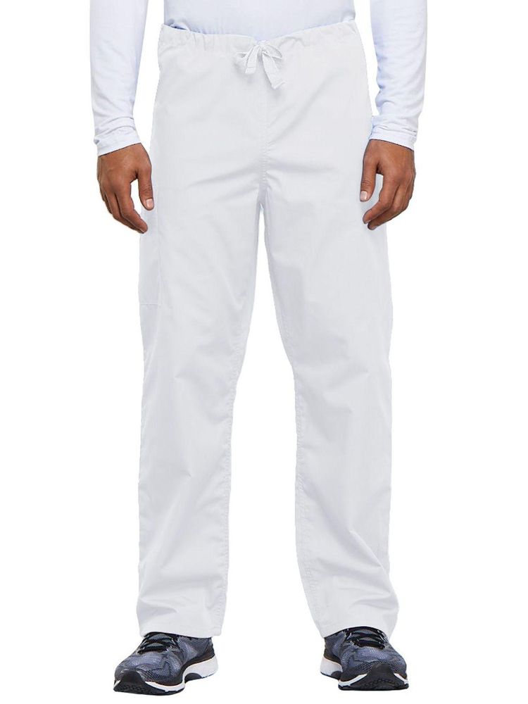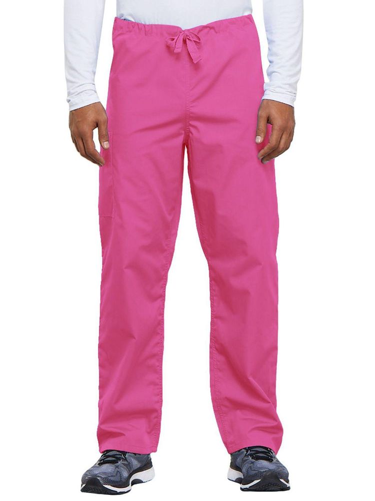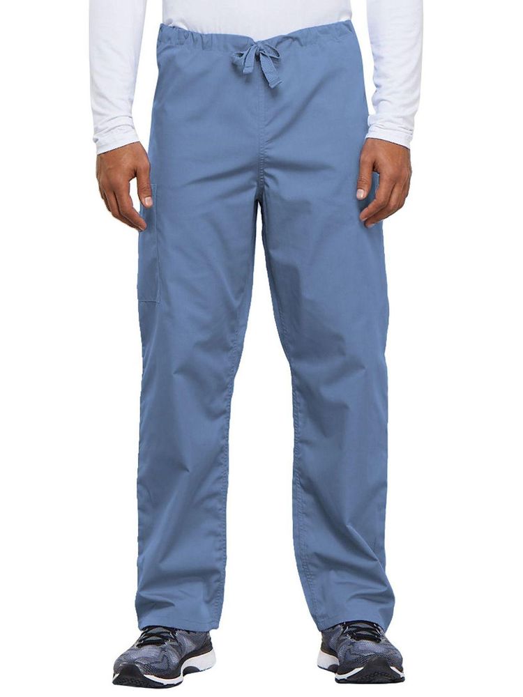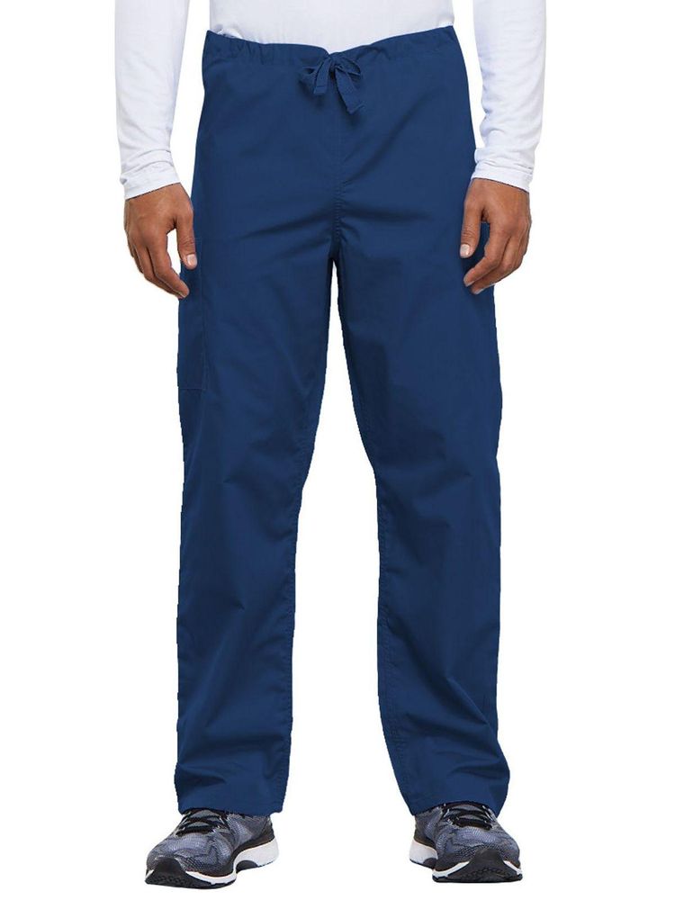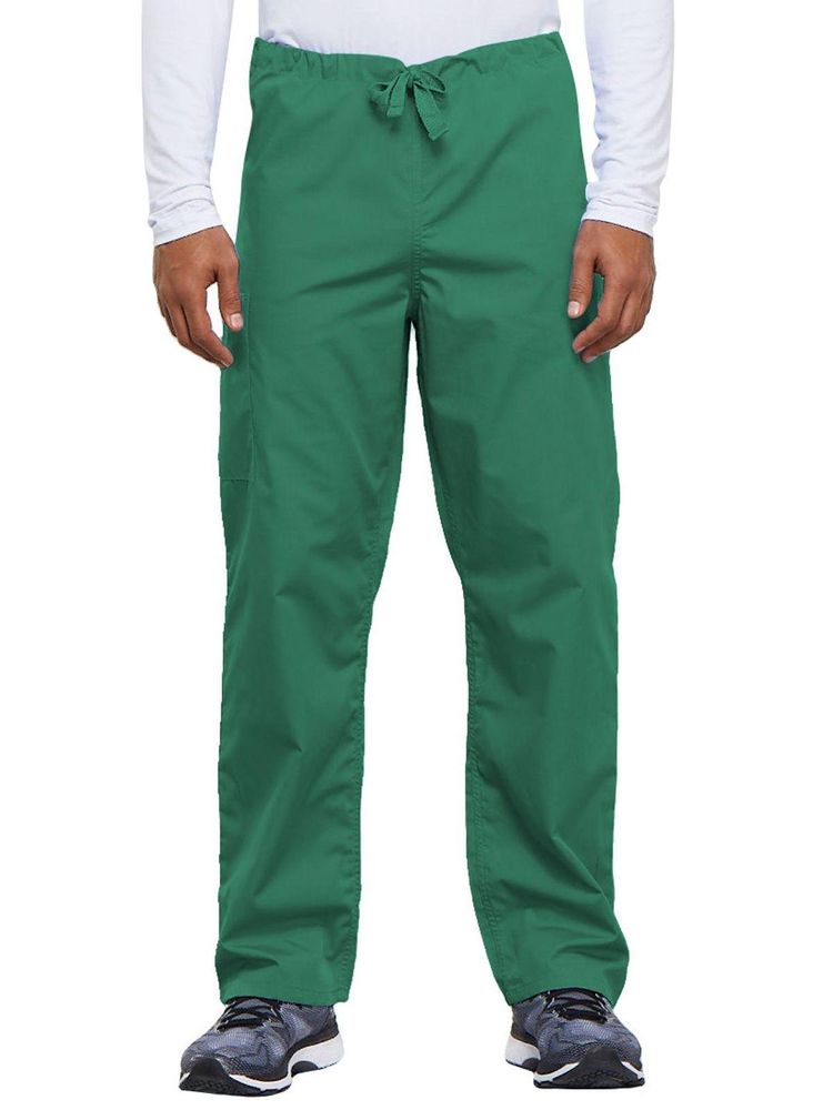 A casual unisex traditional fit pant with a natural rise, an adjustable webbed drawstring at the waist, one back pocket, and a cargo pocket with an inside cell phone pocket.