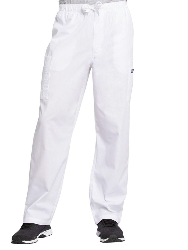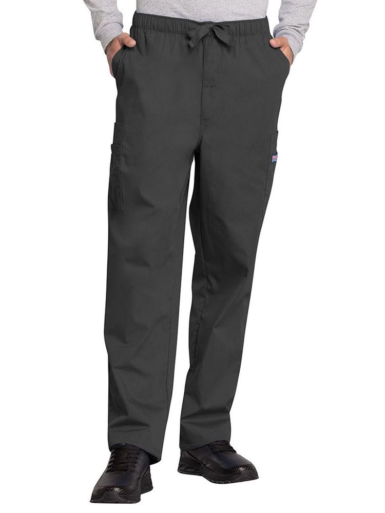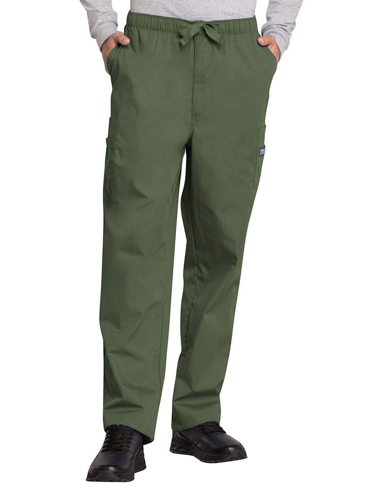 A men's traditional fit natural rise, elastic waist pant with a webbed drawstring, a functional zip fly, four side cargo pockets, front angled pockets, and a back patch pocket.